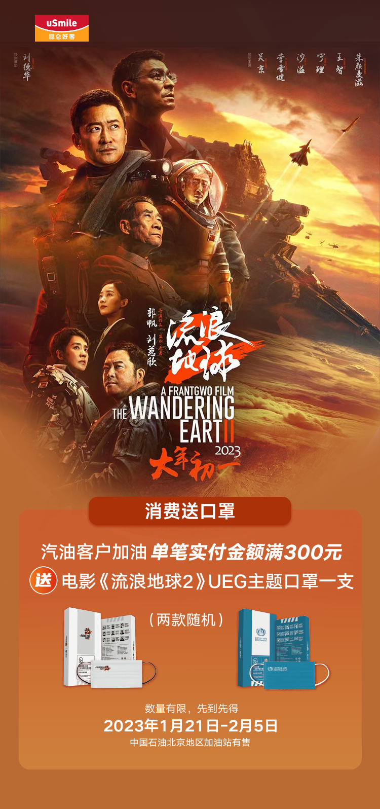汽油客户加油满300元送“流浪地球”主题口罩1支