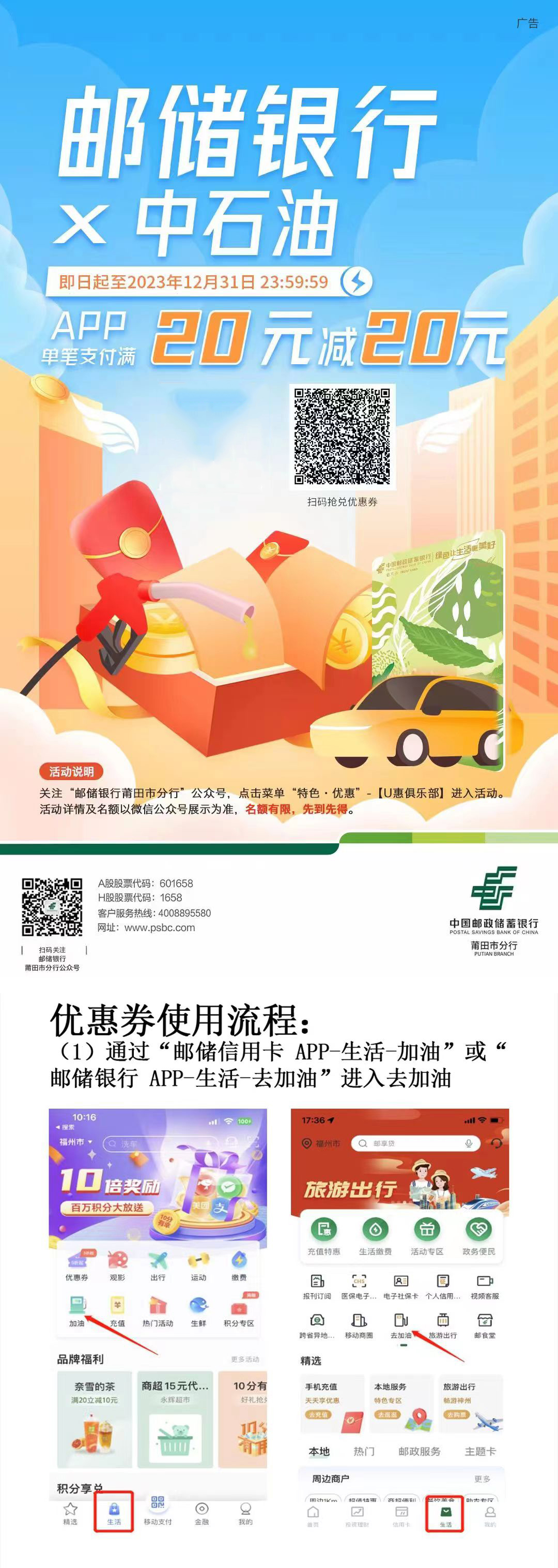 单笔支付满20减20!中石油莆田携手邮储银行惠出行!