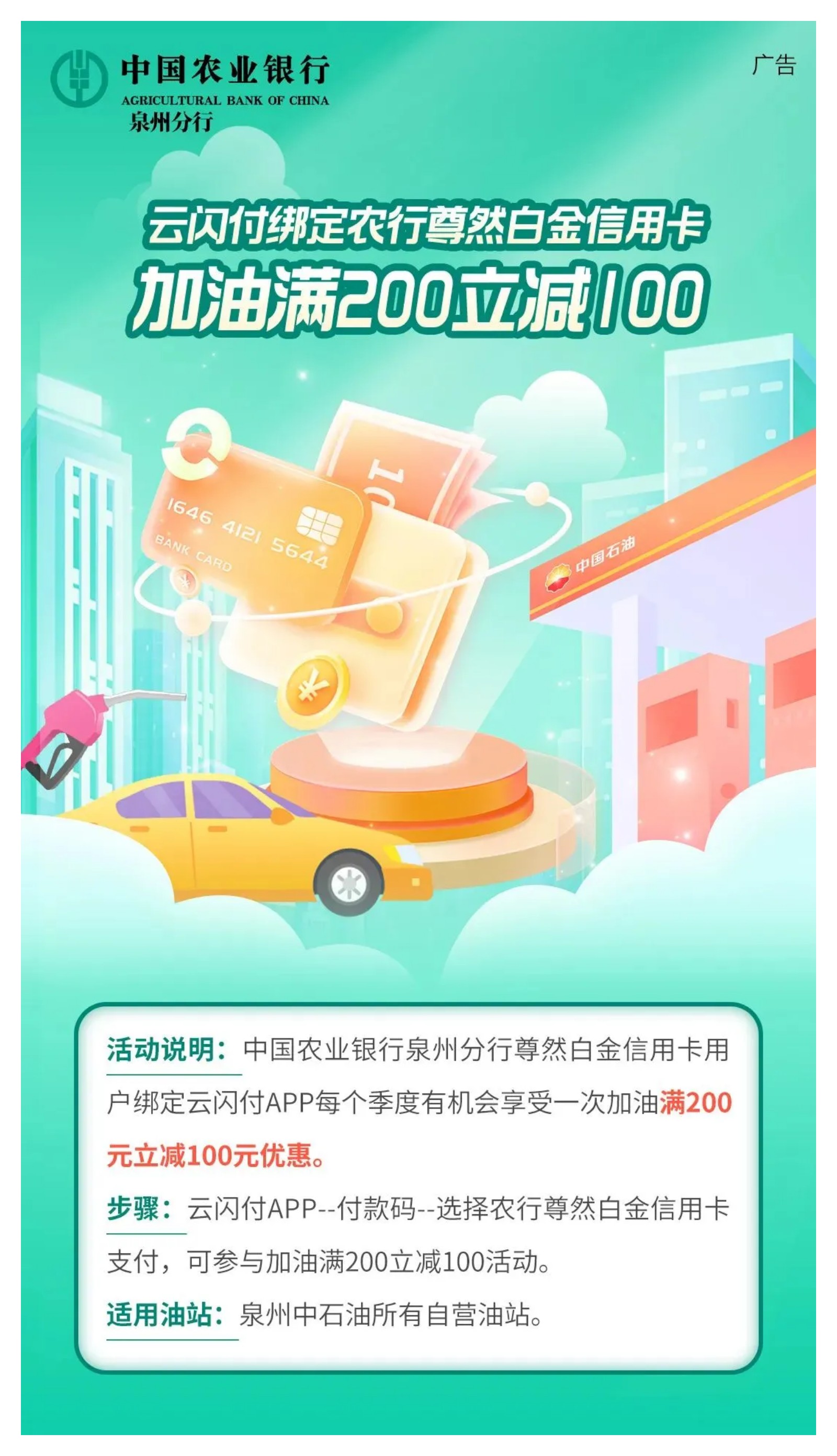 加油满200减100!中石油泉州携手农行、云闪付惠出行!