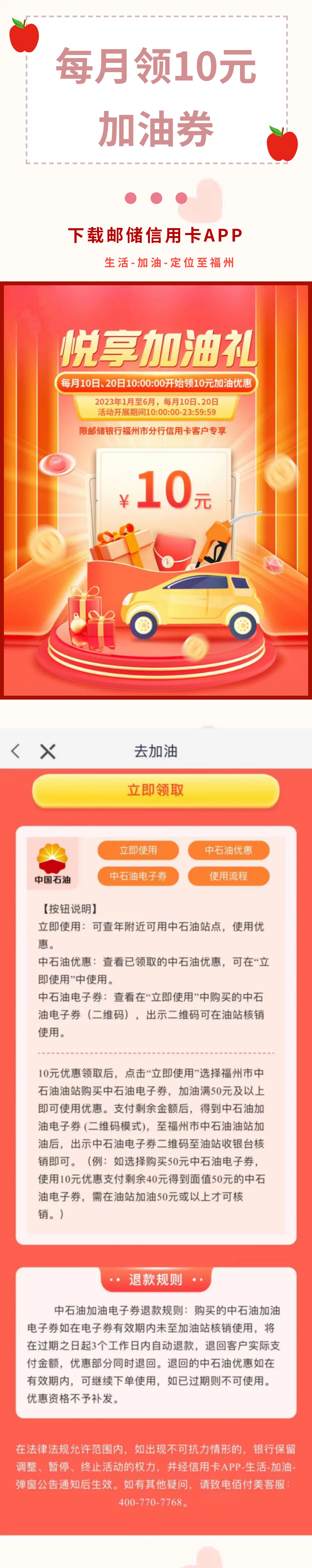 每月领10元加油券!邮储银行信用卡福利惠出行!