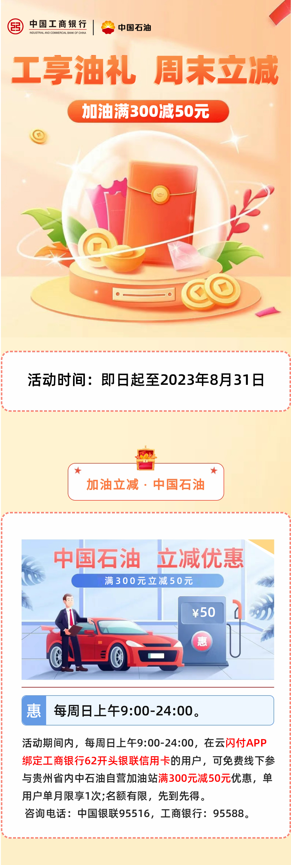 工行油礼,周末立减!加油满300减50元!