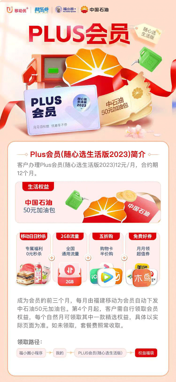 办理福利移动PLUS会员,送50元加油包!