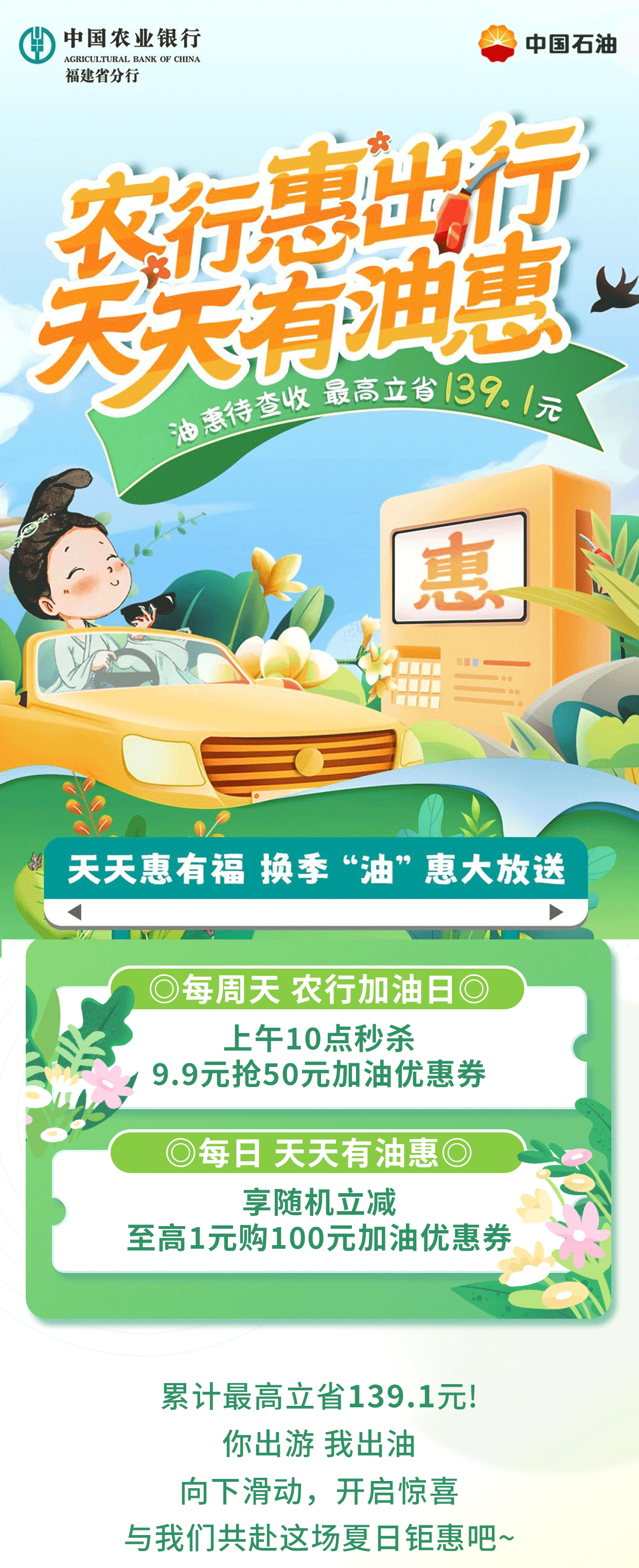 农行惠出行,天天有油惠!至高享1元购100元加油券!