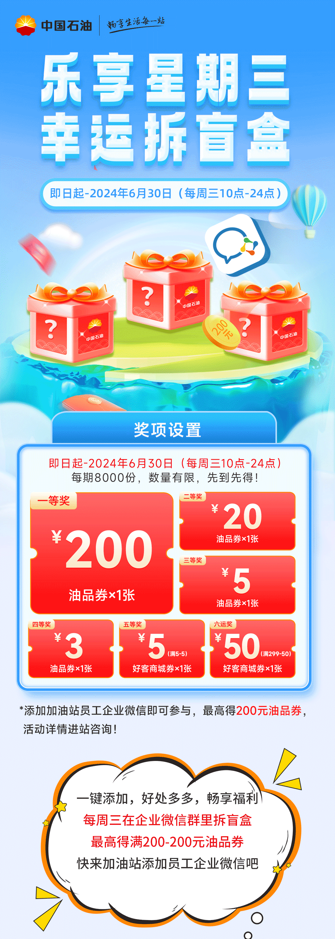 周三企微粉丝福利日,拆盲盒最高得200元油券!