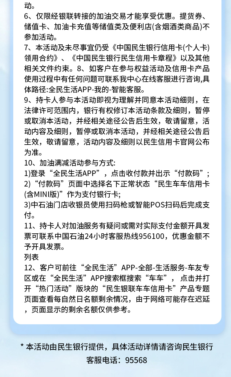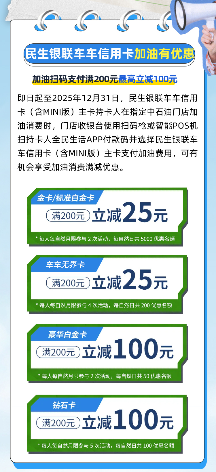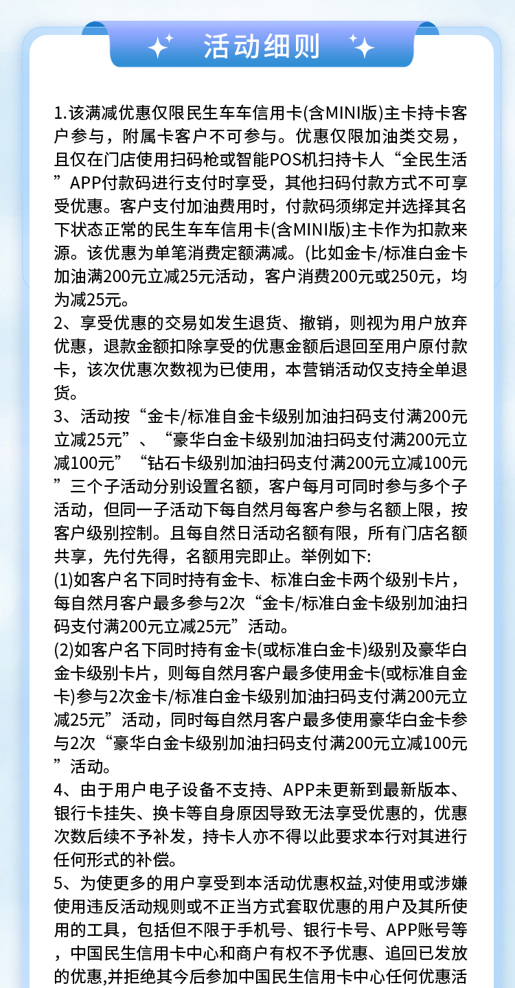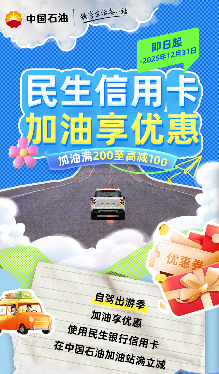民生银行信用卡,加油满200至高减100元!